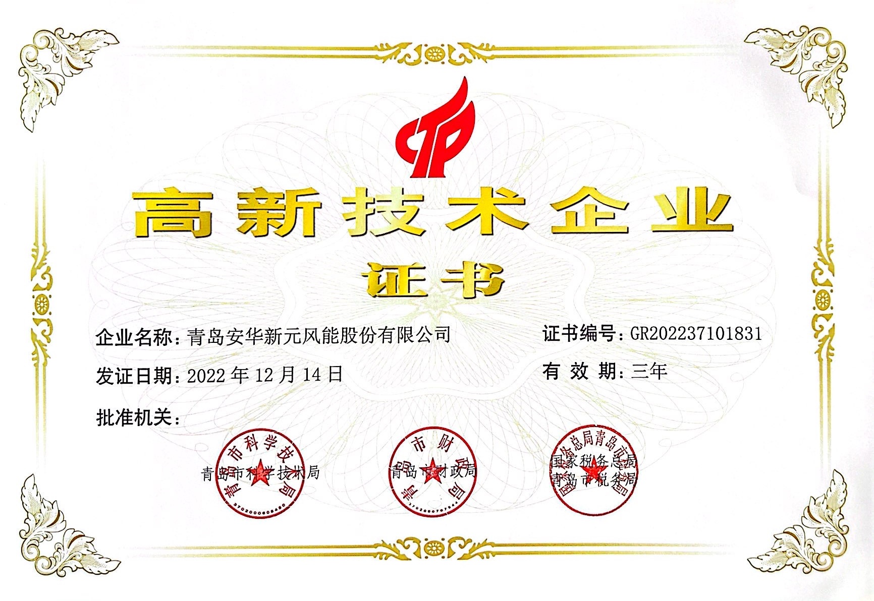 國(guó)家高新技術(shù)企業(yè)證書(shū)